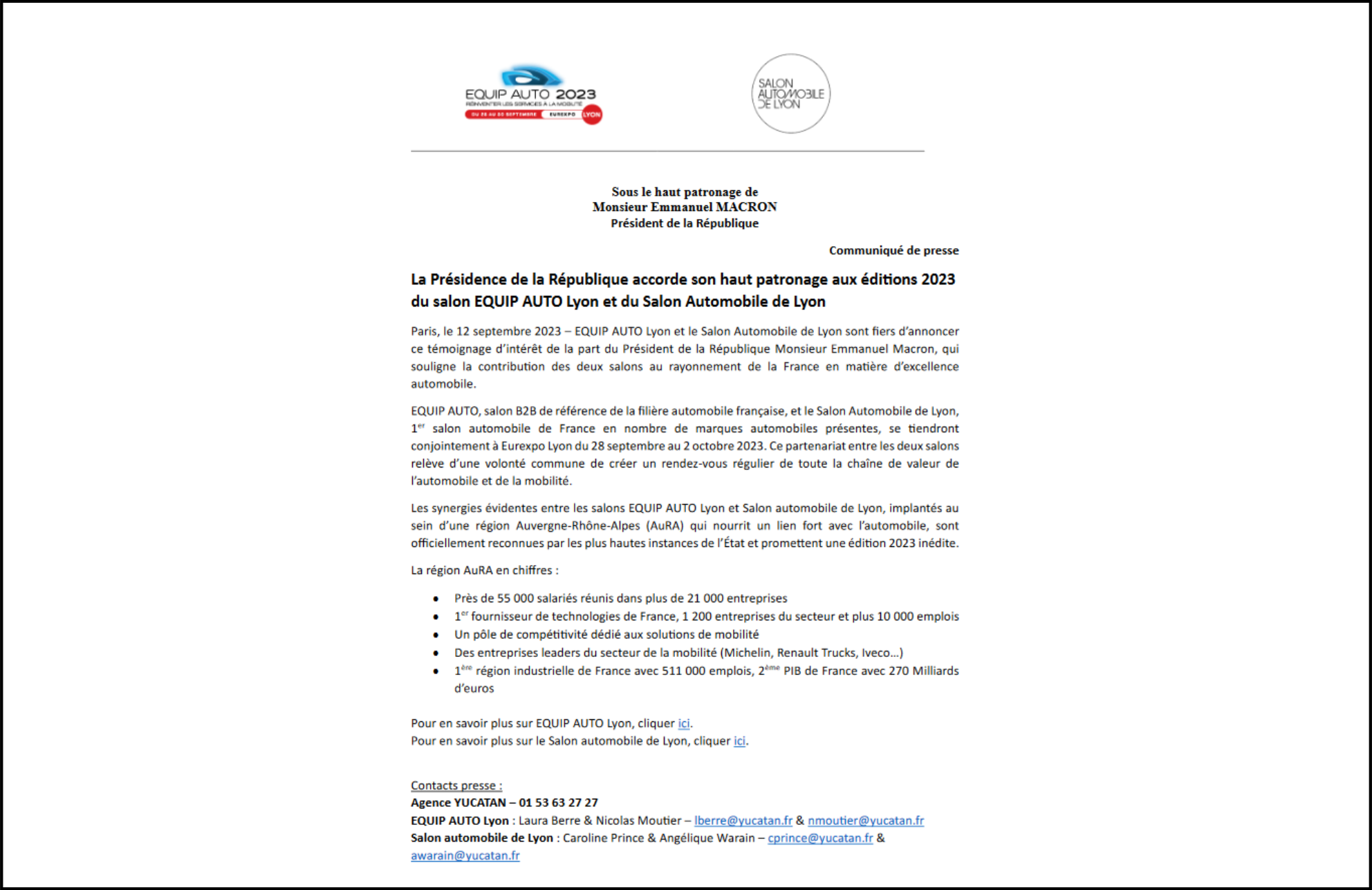 La Présidence de la République a accordé son haut patronage aux éditions 2023 du salon EQUIP AUTO Lyon et du Salon Automobile de Lyon